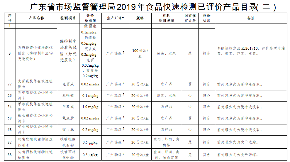 此次验证根据《广东省食品药品监督管理局关于规范食品快速检测产品使用管理的通知》(粤食药监办科〔2018〕680号)要求开展,评价活动验证项目包括:农药残留项目、水产品药物残留项目、瘦肉精药物残留项目及其他药物残留等多种项目,涉及项目种类繁多。