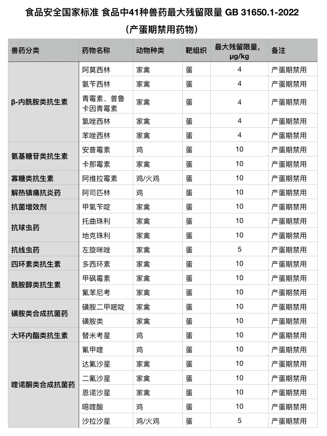 关于靶组织为“蛋”的标准共29项,补充产蛋期禁用药物限量25项,增加停用药物限量4项。临床上使用蛋鸡产蛋期或乳畜泌乳期禁用的药物,或在鸡蛋、牛奶中检出相关药物的残留,属于养殖环节超范围、不规范用药范畴。