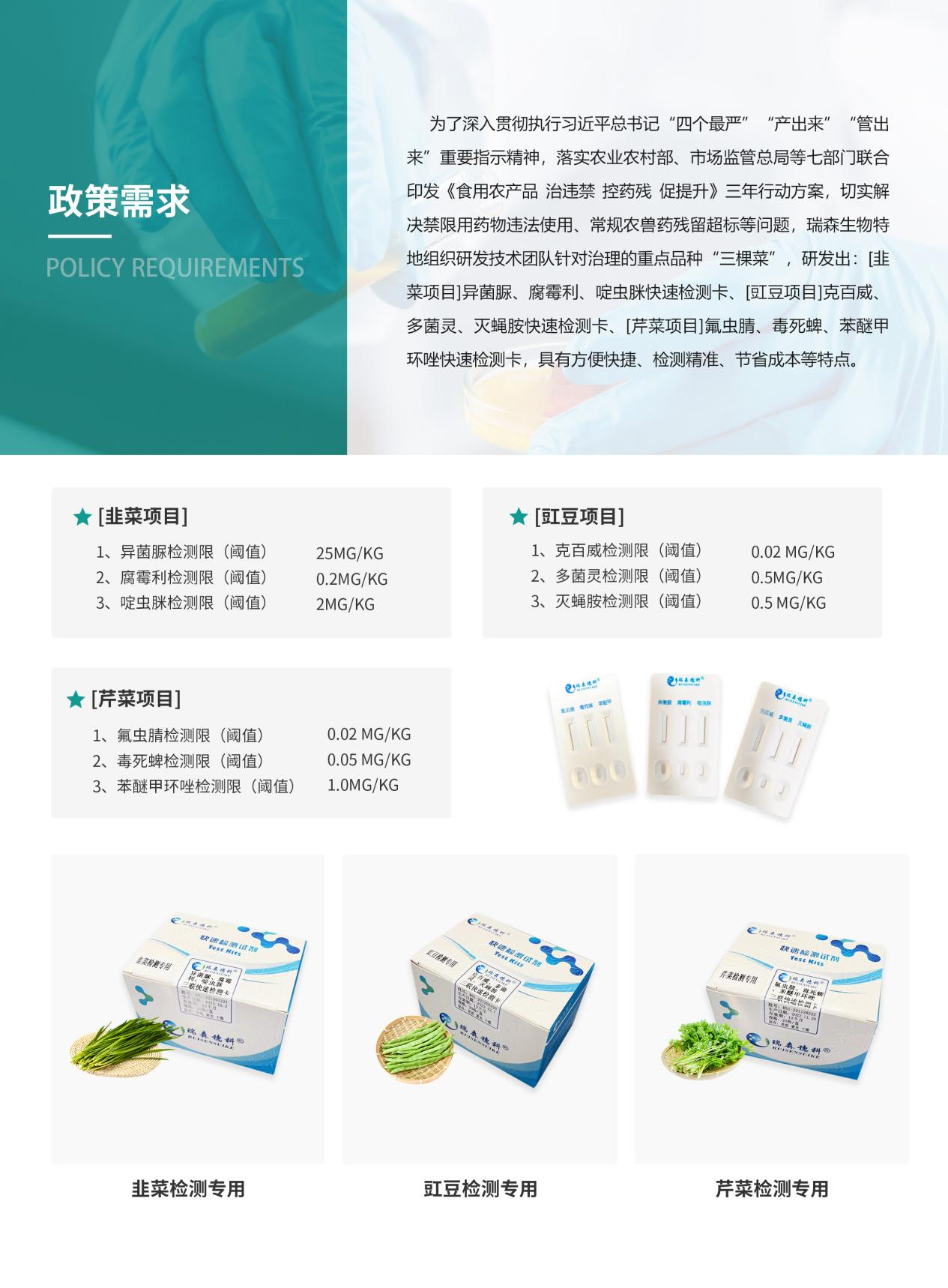 瑞森生物认真学习和贯彻农业农村部2023年全国农产品质量安全监管工作会议精神,积极拥护和响应《中华人民共和国食品安全法》。早在2021年国家农业农村部发布了《食用农产品“治违禁 控药残 促提升”三年行动方案》的通知后,瑞森生物就积极拥护和响应文件精神,并针对《方案》中提到的需要重点治理的11种农产品:“三棵菜”、“一枚蛋”、“一只鸡”、”肉牛肉羊“、“四条鱼”,推出了相关的新品应对方案,包括”农药残留胶体金多联检测产品系列“、”禽蛋药残专项检测解决方案“、”荧光定量快速检测产品“等相关技术领先的新型检测产品。有效解决了国家食用农产品存在的安全隐患问题,充分保障了老百姓”菜篮子“上的安全。