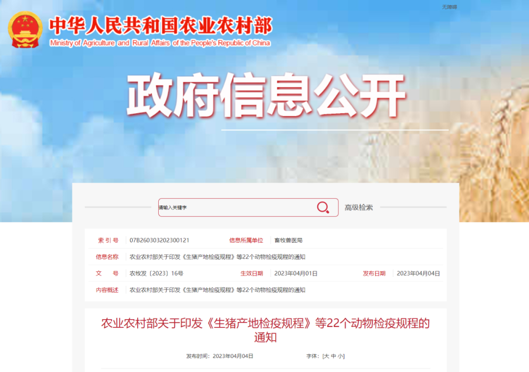 为进一步规范动物检疫工作,按照《中华人民共和国动物防疫法》、《动物检疫管理办法》规定,我部修订了《生猪产地检疫规程》等19个检疫规程,制定了《马属动物屠宰检疫规程》、《鹿屠宰检疫规程》、《动物和动物产品补检规程》。现将上述检疫规程印发给你们,请遵照执行。
