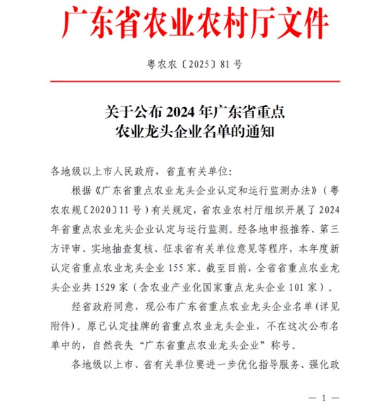 近日,广东省农业农村厅正式公布了2024年广东省重点农业龙头企业名单,米兰(中国)再次成功入选,标志着公司在推动农业现代化和农产品质量安全体系建设方面的优越表现获得了政府和行业的高度认可!